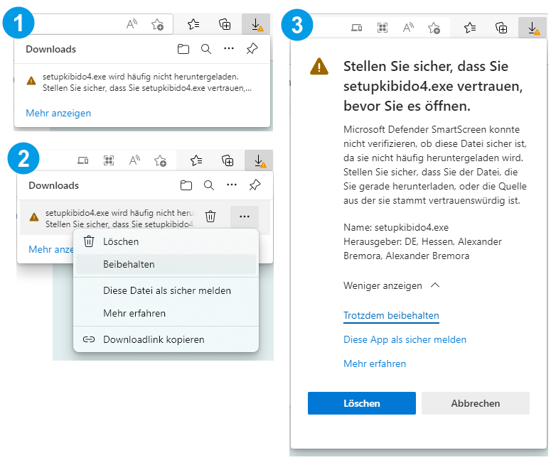 Bei einigen Browser wird der Download von KiBiDo blockiert. Bitte gehen Sie wie folgt vor, um KiBiDo auf Ihren Computer zu speichern.